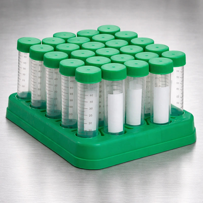 Perfect for agar slants and the Castellani Method, these sterile 50 mL conical tubes come ready to use in a reusable plastic rack. Designed for organized lab work without needing a full case.